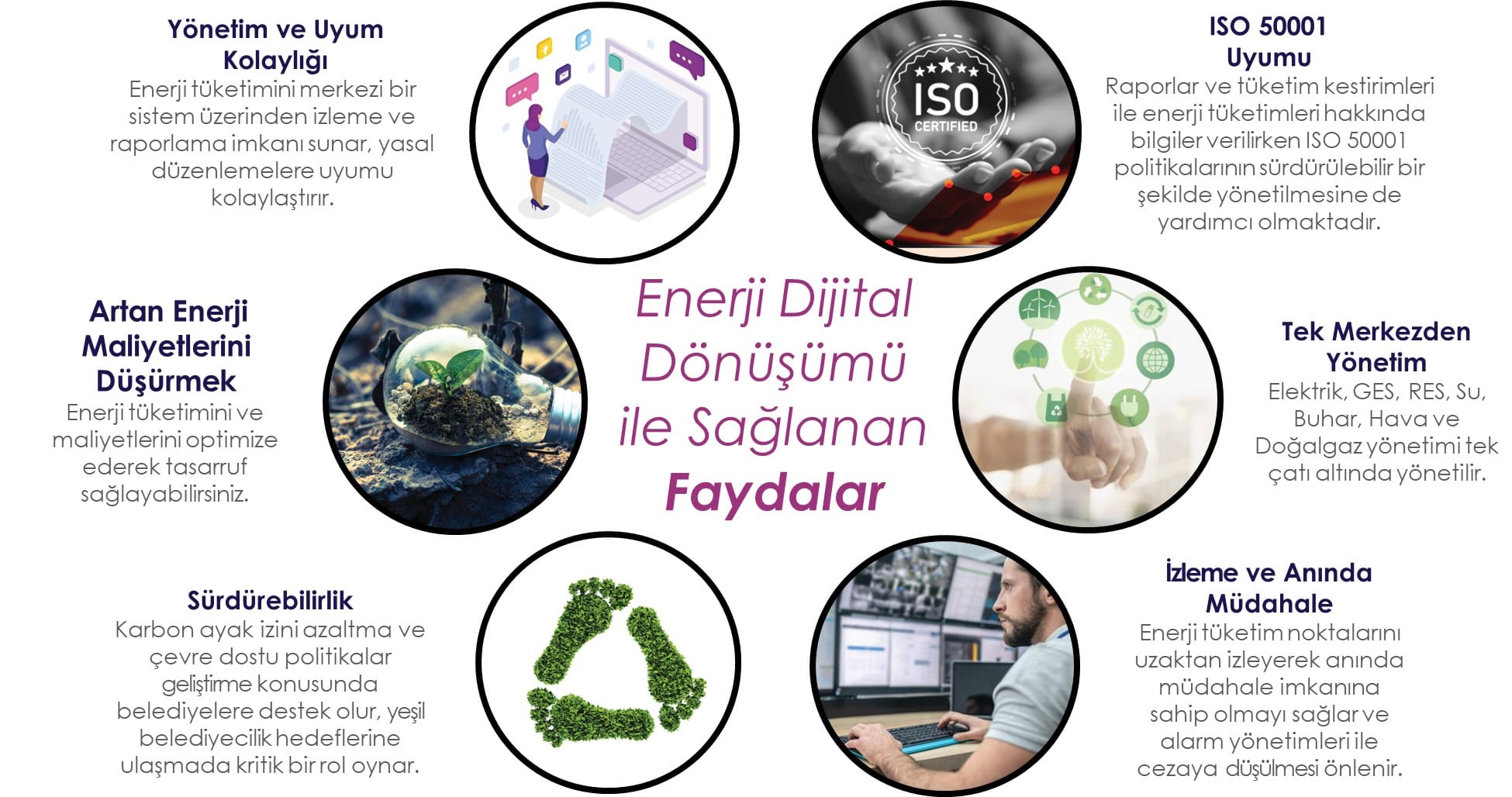 Dağınık ve kompleks yapıda olan işletmelerde, tek bir merkezden kolay ve verimli enerji yönetimi ile enerji verimliliği sağlar.